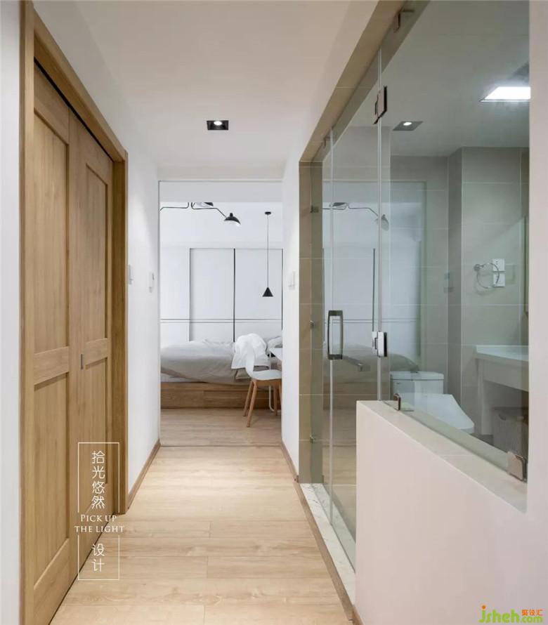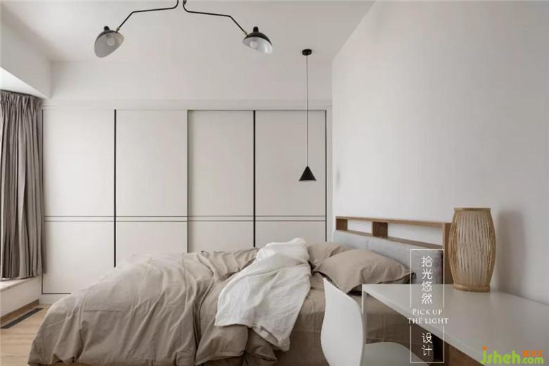 原本二楼是三间布局不合理的卧室,改造以后,变成一个包含衣帽间、书房和主卫的超级主卧,卧室简单素雅,用重色小小点缀,灯的颜色和材质丰富了空间观感