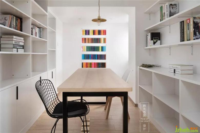 书房的柜子颜色统一、形式独立,装饰挂件是从荷花池买了铅笔,挨个排好以后挂上去的
