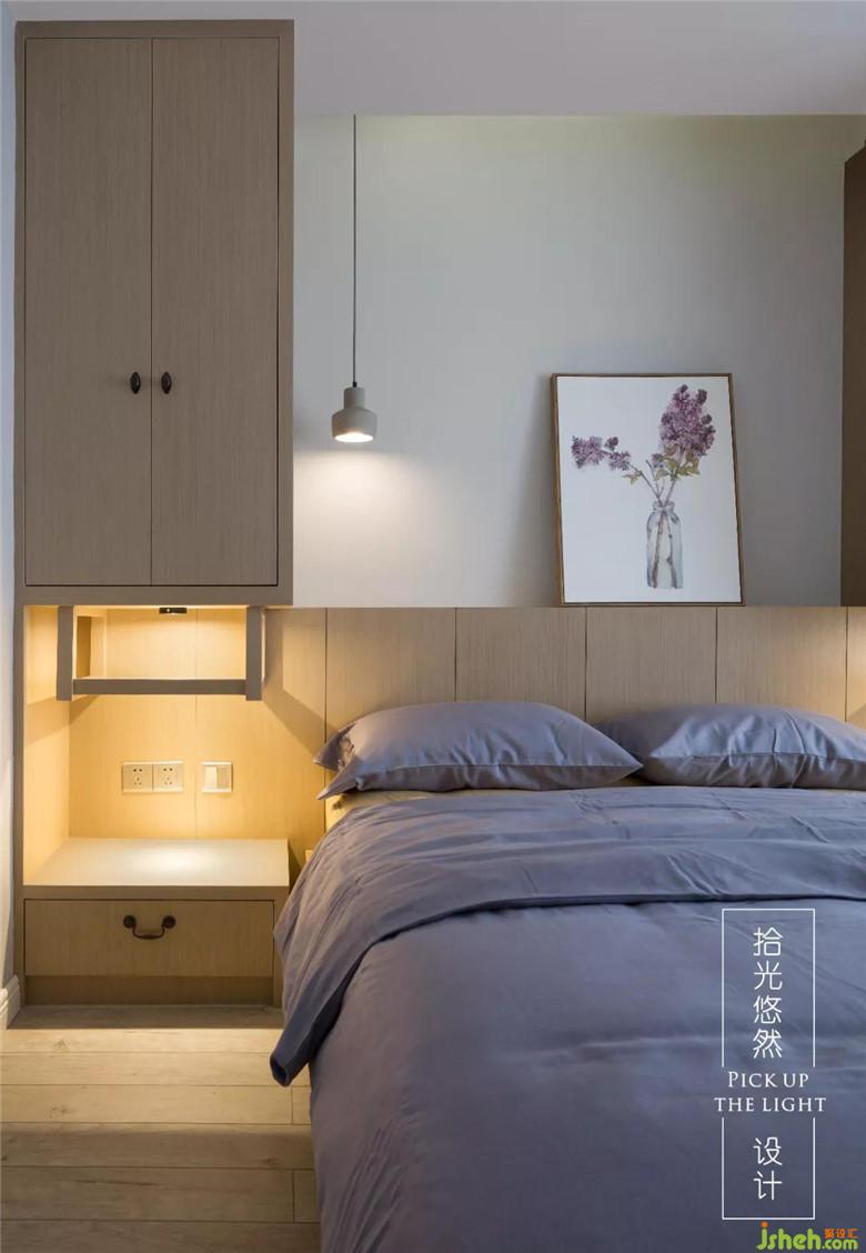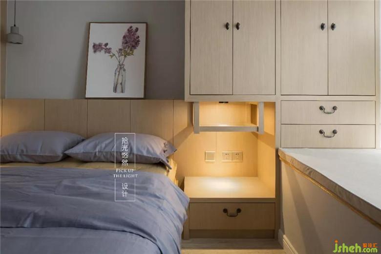 取消传统的衣柜设计方式,利用床头柜的空间,制作了悬空柜,解决收纳问题,现场制作的床更贴合整体空间