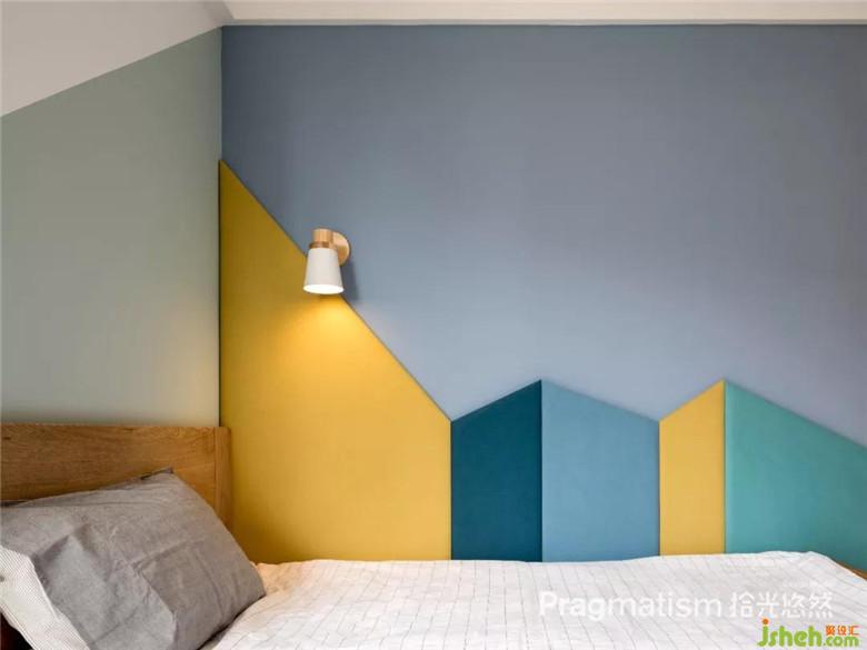 兒童房設計在整體北歐日式簡約風上,著重選擇了色彩飽滿的硬包拼接工藝,防止兒童睡覺時發生磕碰同時增加童趣感。