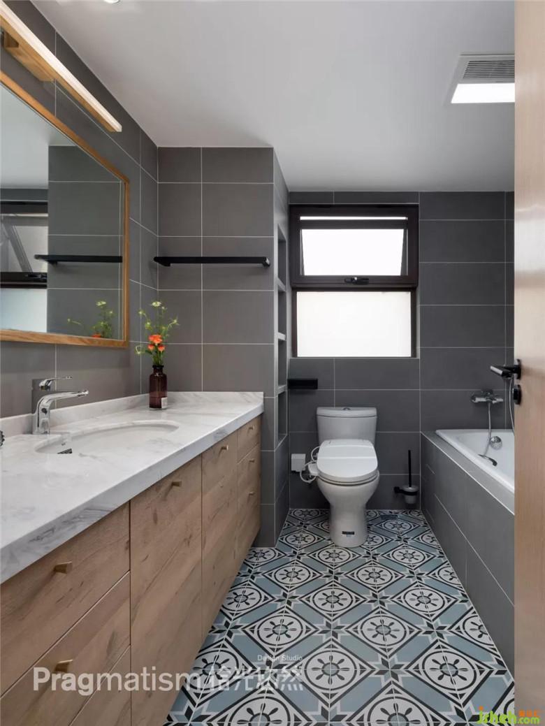 装修公司通過空間改造做出浴缸區域,地面拼接花磚讓簡約的浴室不簡單。