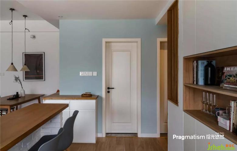 餐厅摆了一张1.6米的大餐桌,亲友小聚也可以从容应对。扩大餐厅的功臣,与卡座一体的餐边柜,餐边柜右边是厨房。