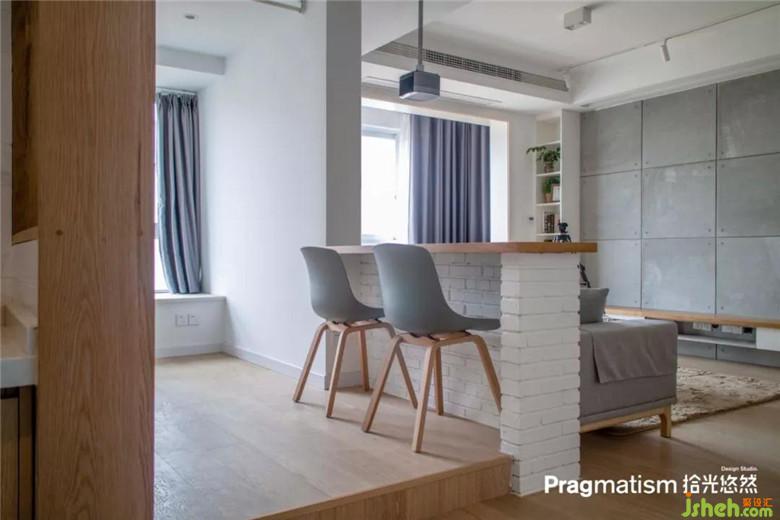 因为入户门是紧挨着墙体的,所以我们将鞋柜退后了一些,放了一个实木换鞋凳作为缓冲。