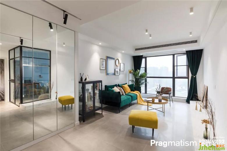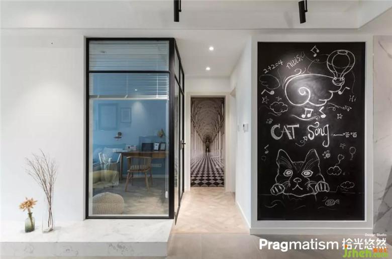 在设计多功能房时,将转角的墙面全部设计成玻璃墙体。一方面来的客人有对猫毛过敏的话就可以做一间隔离室;二是当猫咪们独自在客厅玩耍时不会因为找不到主人而感到孤独焦虑。