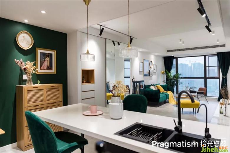 这抹绿继续延续到餐厨区,温暖柔软的天鹅绒餐边椅,缓解墙体的硬朗感,用浓妆淡抹总相宜来形容在合适不过了。