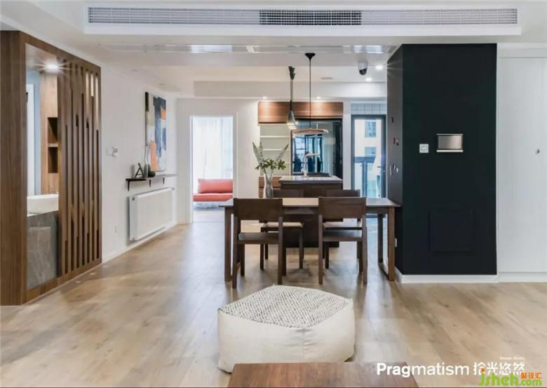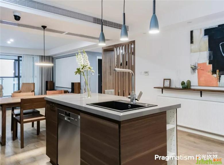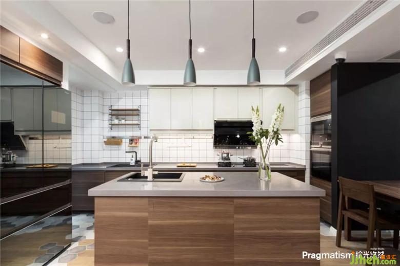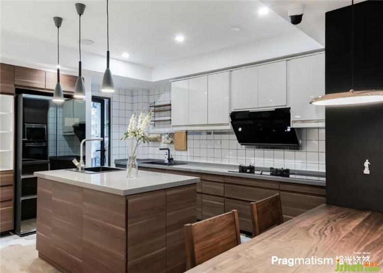 将原有的厨房砸掉以后与原有的餐厅结合,做成橱柜+高柜+岛台+餐厅的方式,采用回字形动线。可以让烹饪变成一件有趣的事情。享受与家人一起分享美食的乐趣。