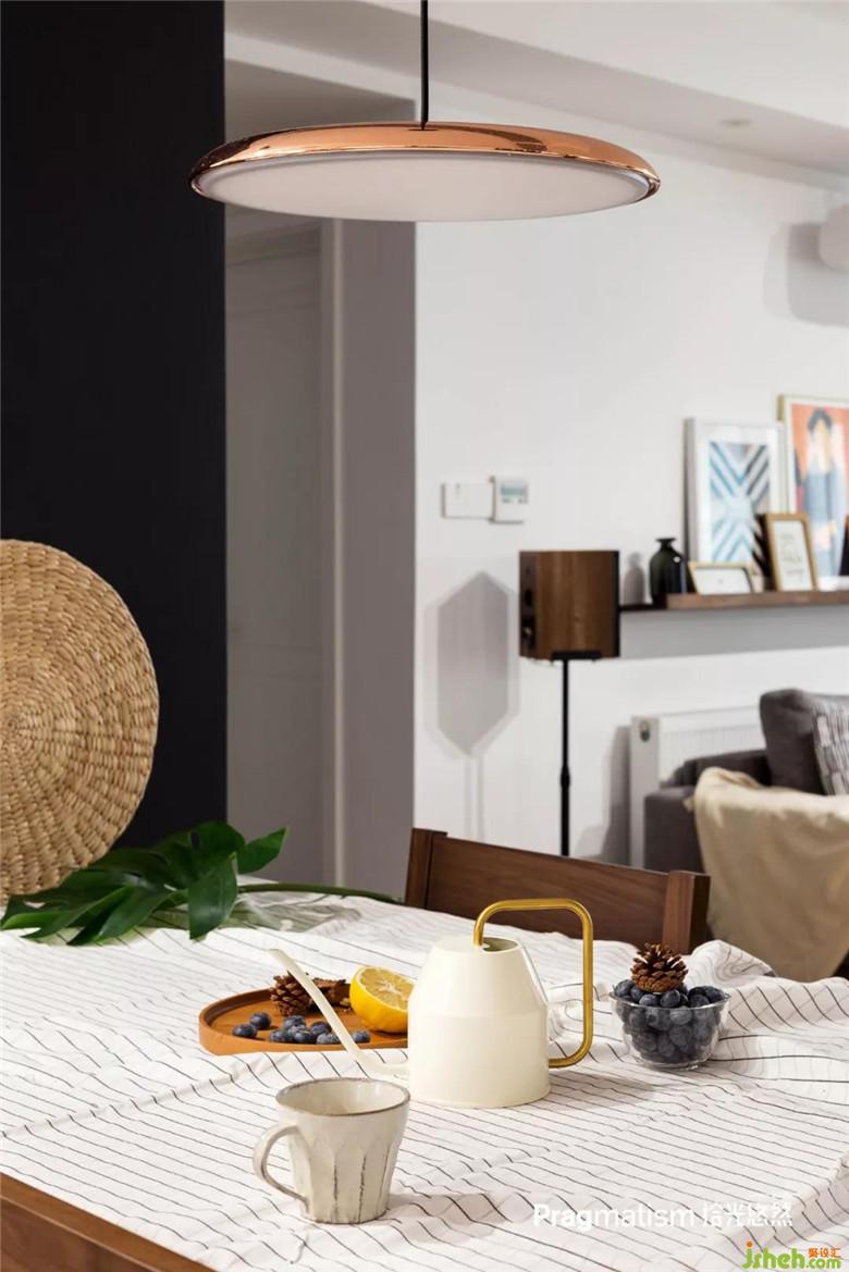 餐厅与厨房结合在了一起,黑色墙是磁力黑板漆,可以用无尘粉笔写写画画,也可以贴冰箱贴之类的磁铁物体。