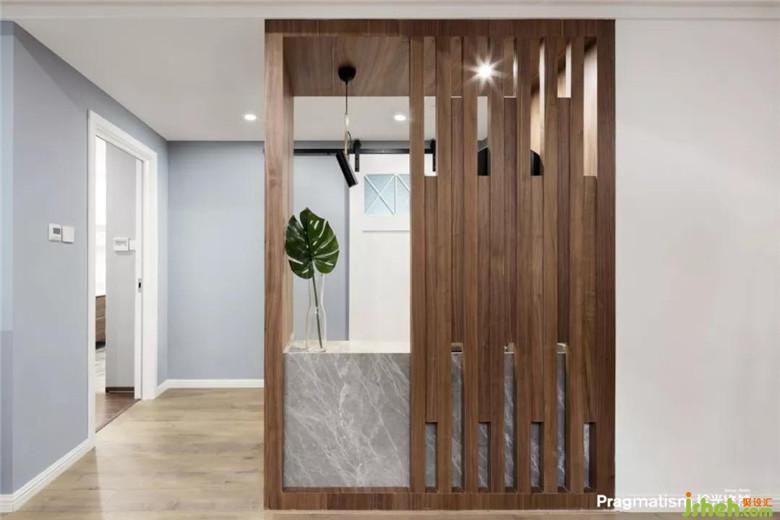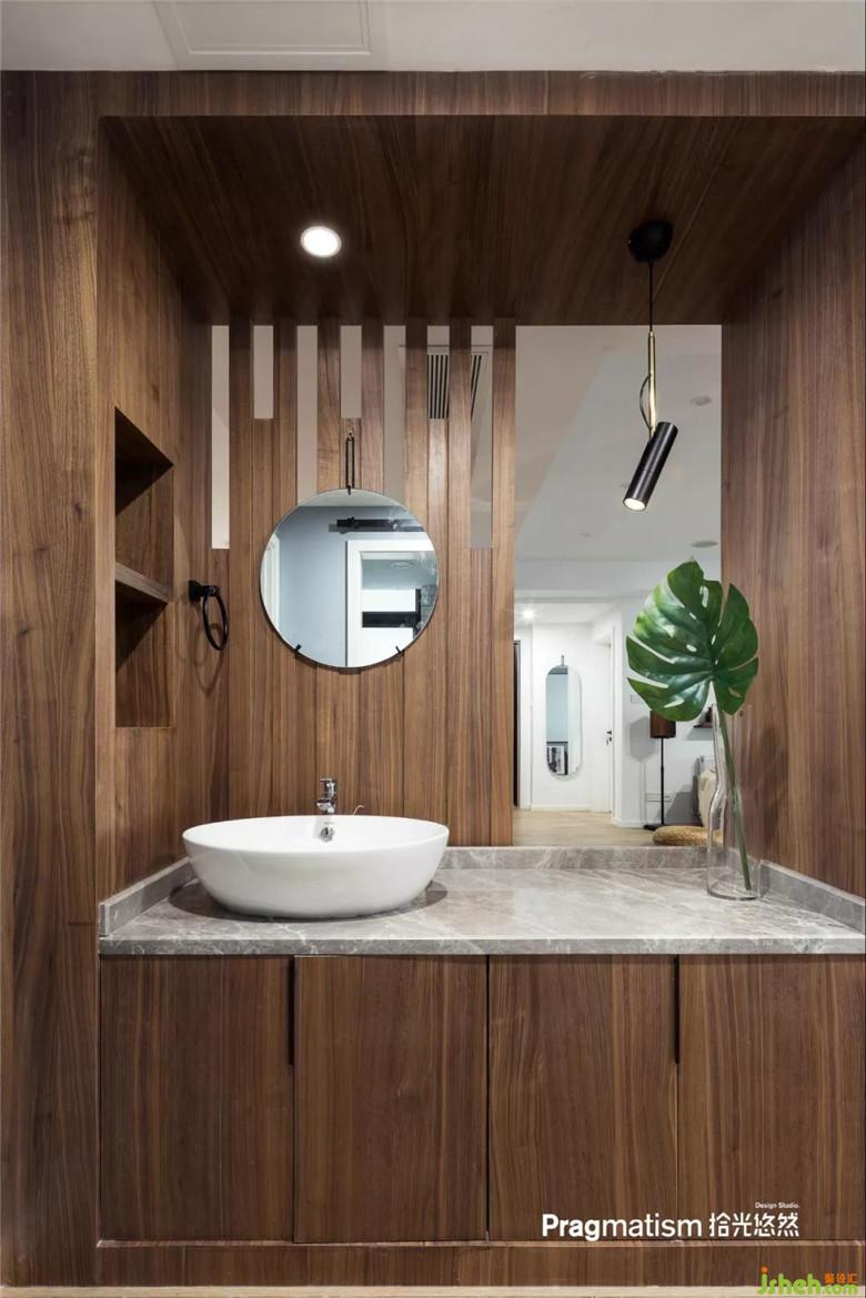 室内设计师将洗面台放置在了过道,可以满足餐厅区域洗手的同时满足卫生间的需求,整个结构与样式为现场制作,采用天然胡桃木饰面板饰面。