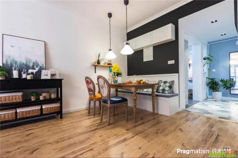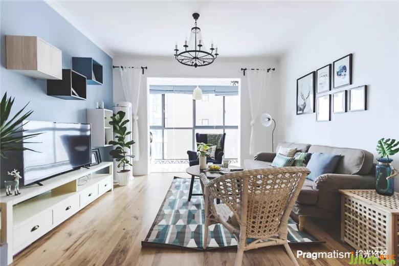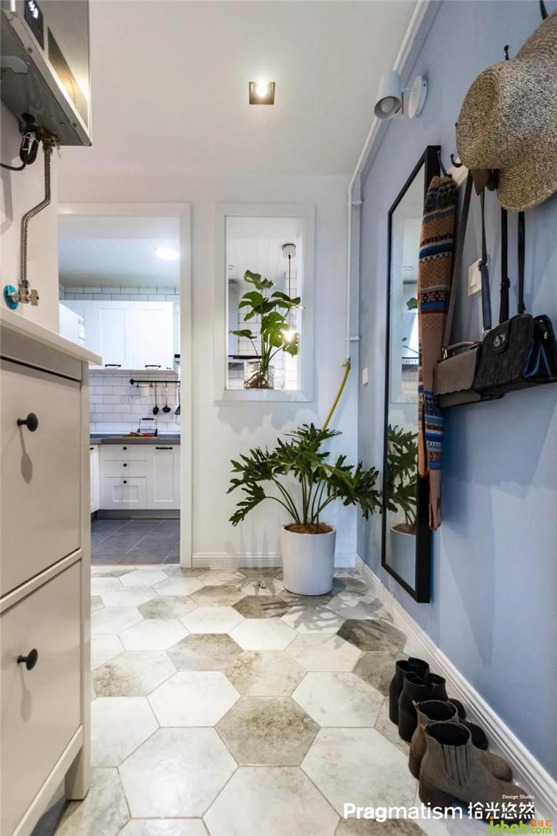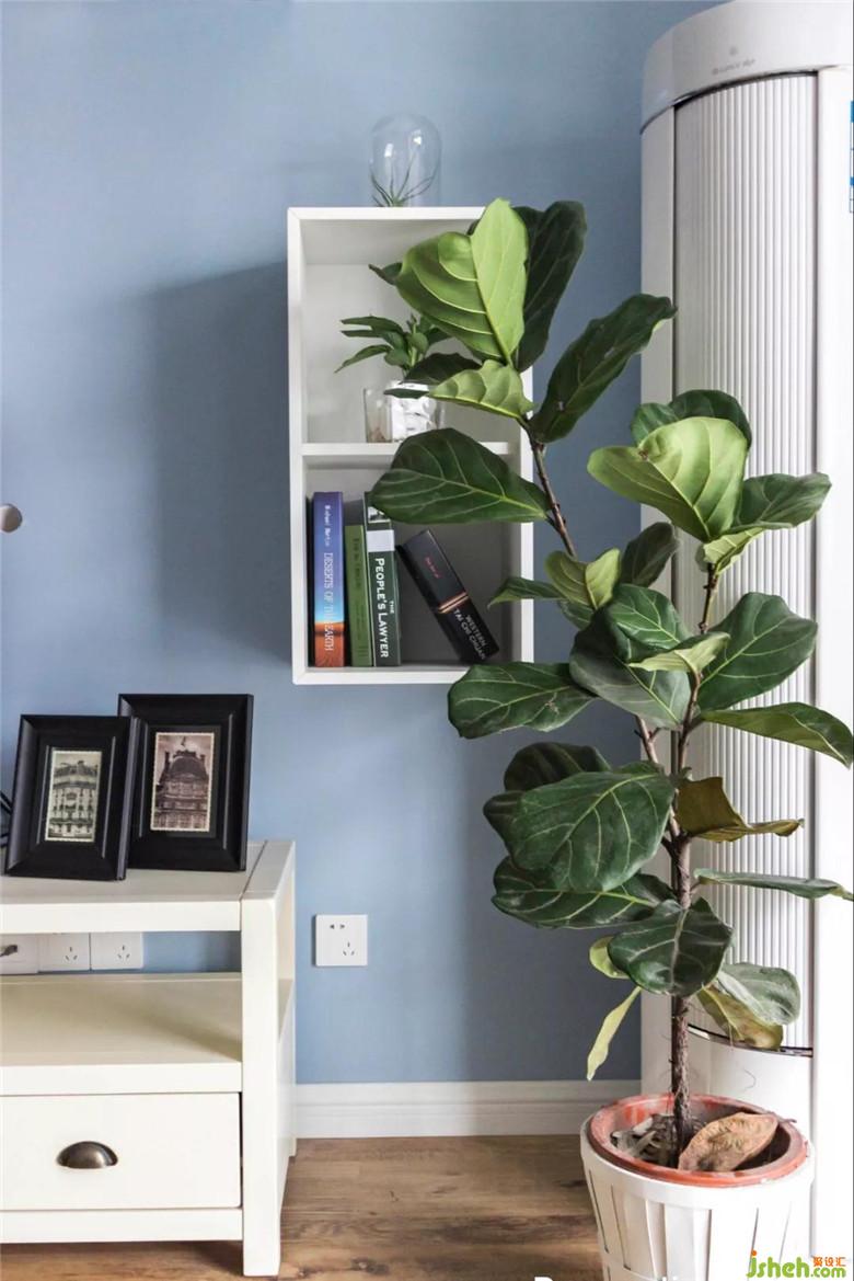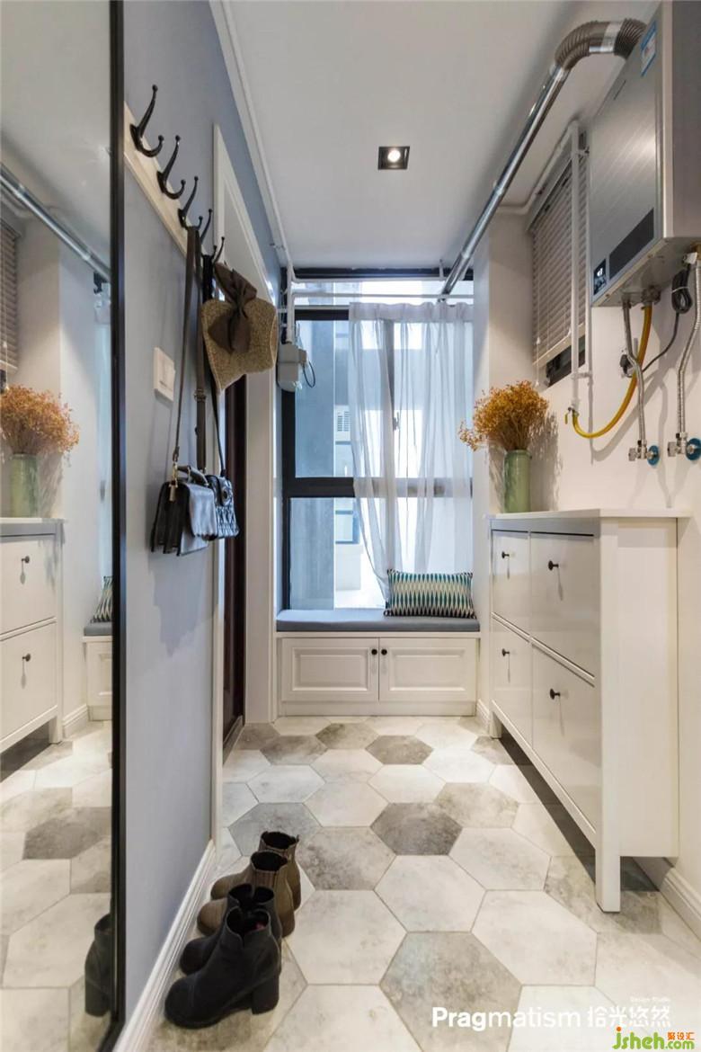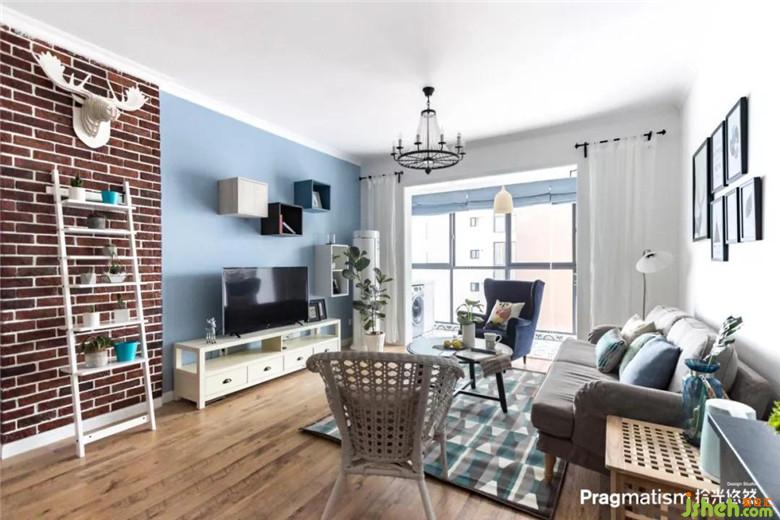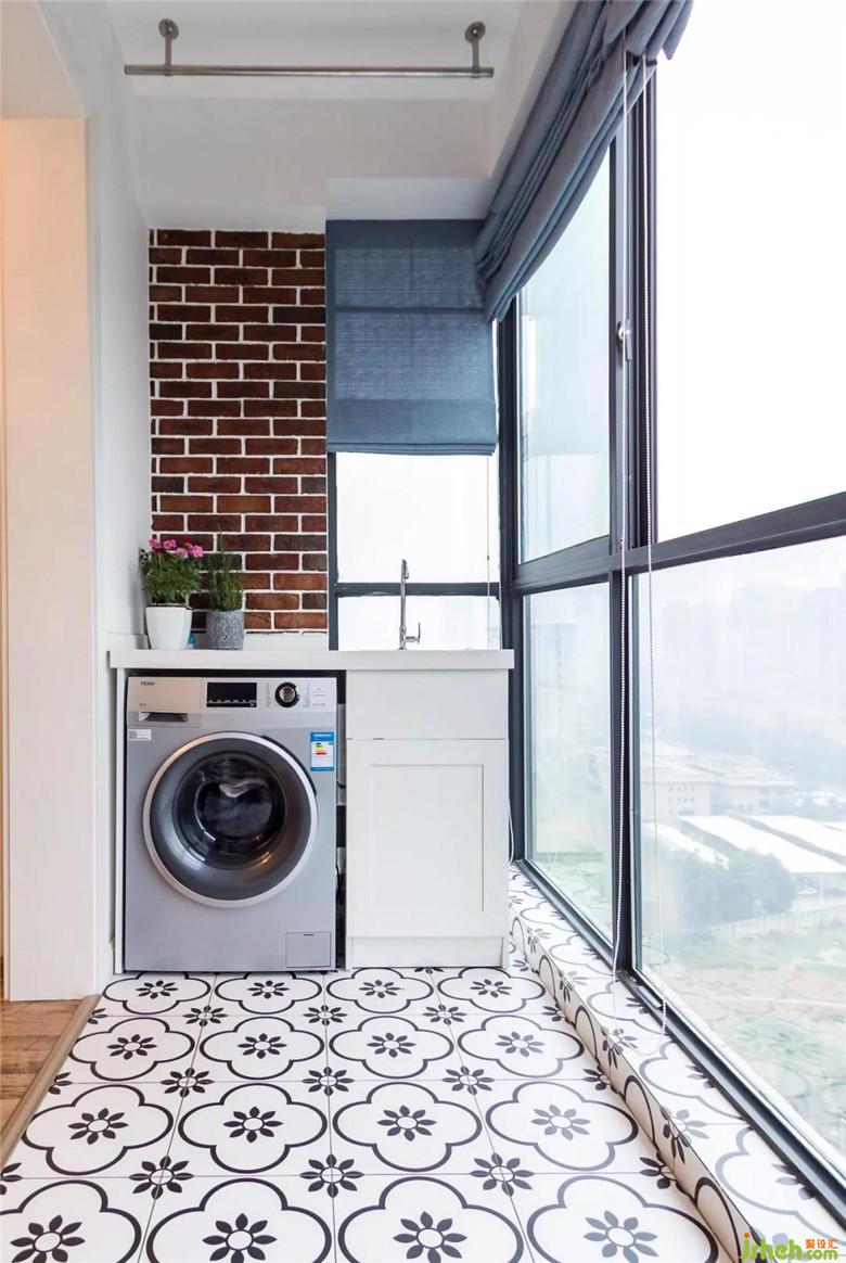 没有生活阳台,于是决定将休闲阳台利用起来。水池和洗衣机的位置都恰到好处,灰蓝色的床帘及红色的砖墙,悄悄地将客厅和阳台融为一体