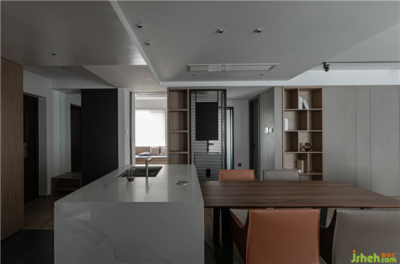 餐厨一体的开放式空间,厨房+岛台的搭配,便于煮饭与洗菜之间密切的配合。无论人身处在那个角落都不会因为是封闭空间而缺少交流感到孤独,三代同堂其乐融融的相处。