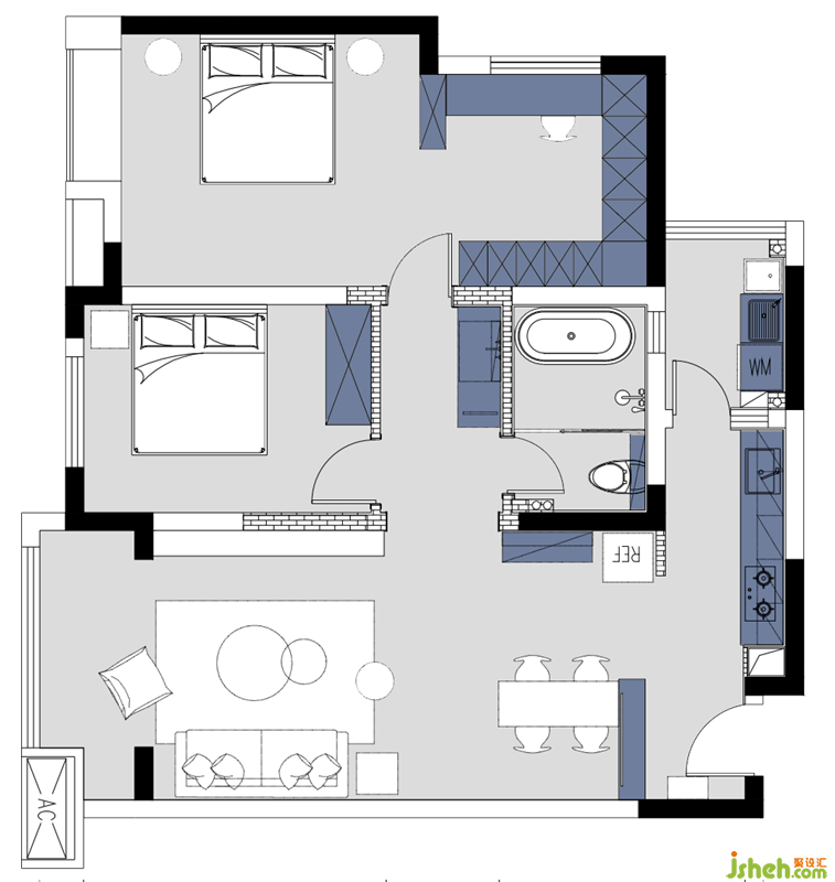解决方式 3. 卫生间墙体拆除重建,同时压缩次卧的部分面积,并改变主卧室的进门位置,以留出盥洗区在过道的空间。干湿分离的方式,来增加卫生间的舒适度。