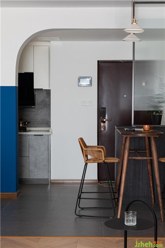 所以进门的空间拆除了原来入户与厨房的隔墙,将空间开放,实现开放式厨房。入户左手边的墙面可以挂包及衣服,同时在鞋柜上方设置长虹玻璃隔断,与客餐厅空间分割。