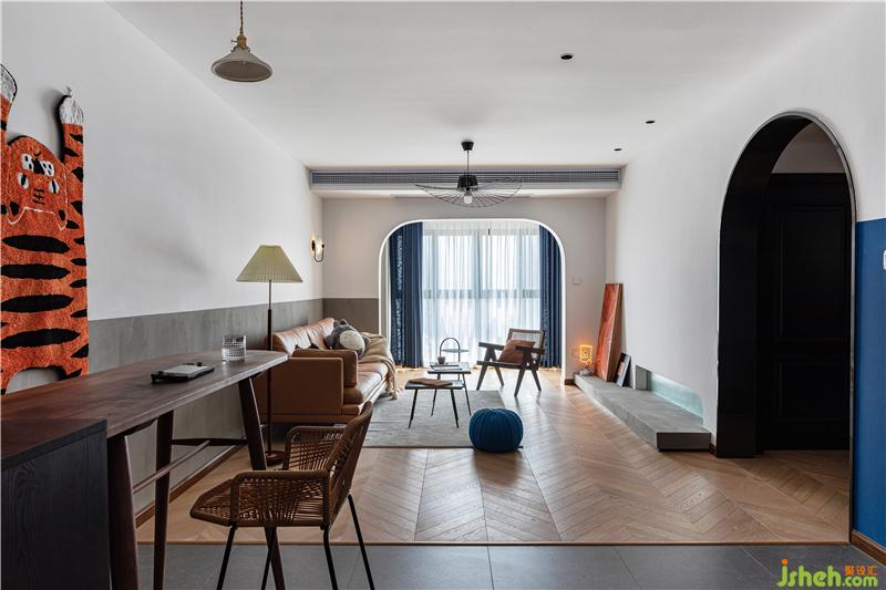 以及客厅区域的弧形门洞,电视墙下方弧形的长虹玻璃造型,增加了整体趣味性,多了一些感受层次。