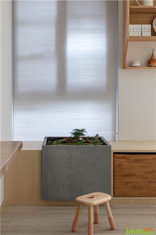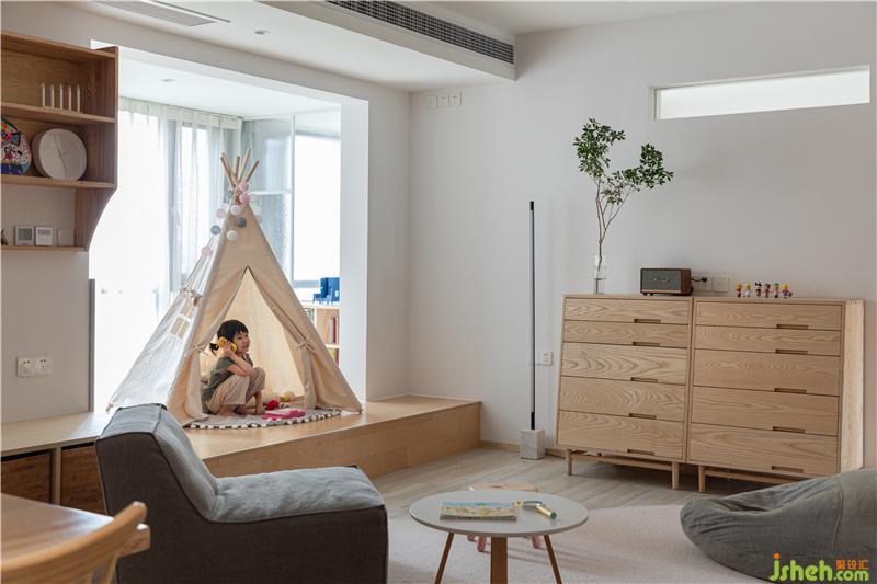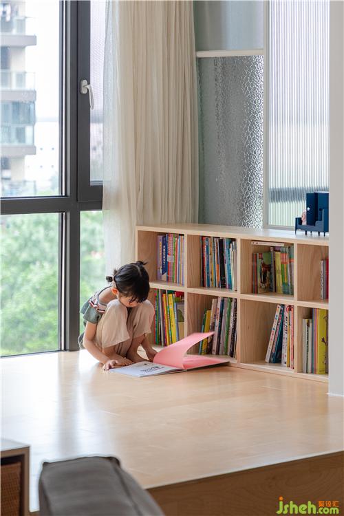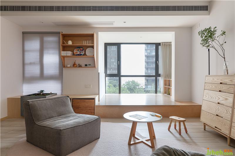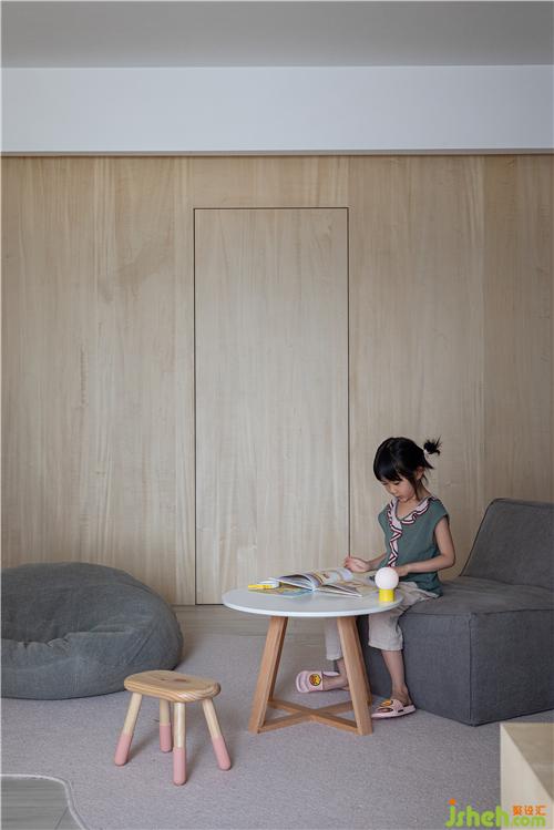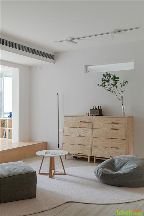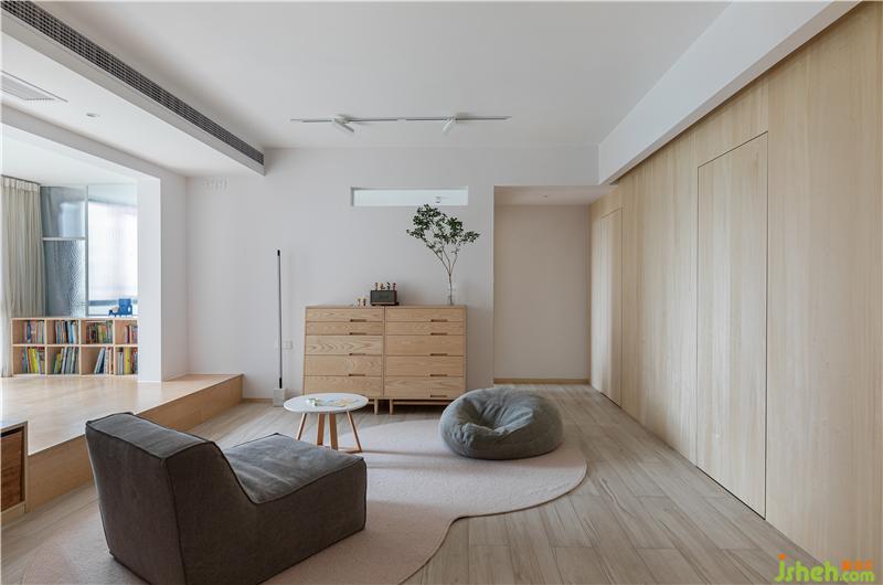 由于屋主对电视的需求度不高,通过去掉电视和电视墙占用的空间,增加了冰箱放置的空间。同时,冰箱上方考虑了置物的收纳盒,可以把不常用的东西收纳进去。家居装修