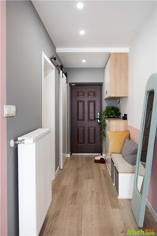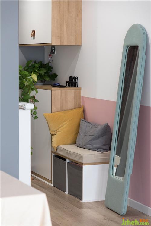 门厅玄关兼具实用与美观,鞋柜中间镂空处可以放置一些日常用品,总长度(含换鞋凳)为2000mm,柜体宽度为350mm。