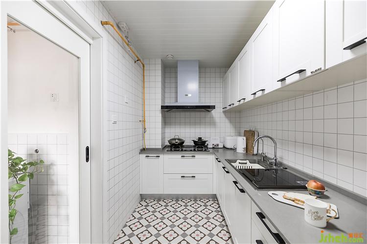厨房与生活阳台连接处拆除部分墙体,并使用通透的白色边框玻璃推拉门隔断,保证厨房的充足采光。