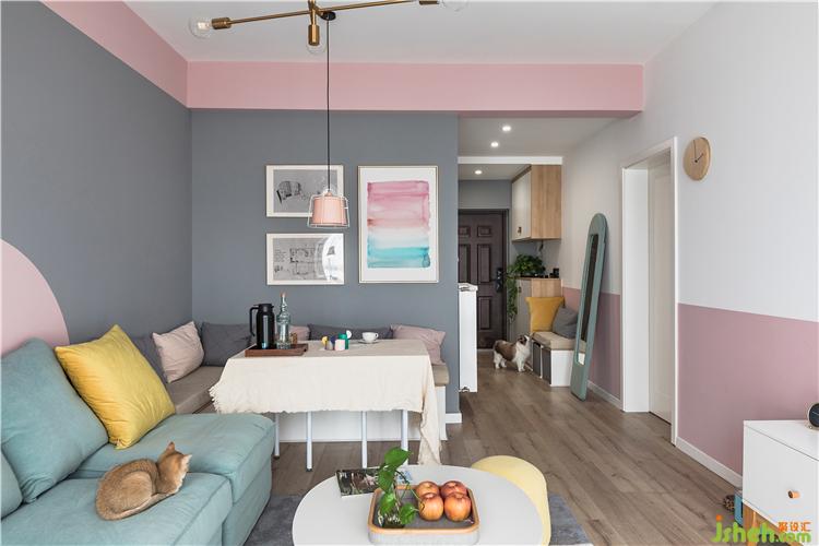 这里就选择使用墙面的乳胶漆分色装饰将其弱化,并把它变成墙面装饰的一部分,如上图的粉色区域。
