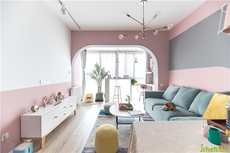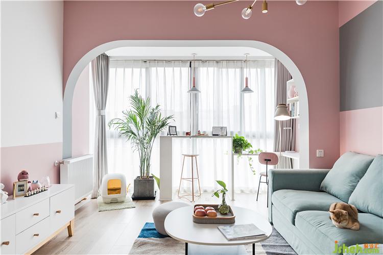 没有过多的吊顶或墙面造型等装饰,只是通过乳胶漆分色进行简单的处理。弧型的的乳胶漆分色造型,与半弧形阳台门洞造型呼应,同时半弧形门洞面壁使用暮云粉,搭配雾霾灰,整个空间都立体了起来。
