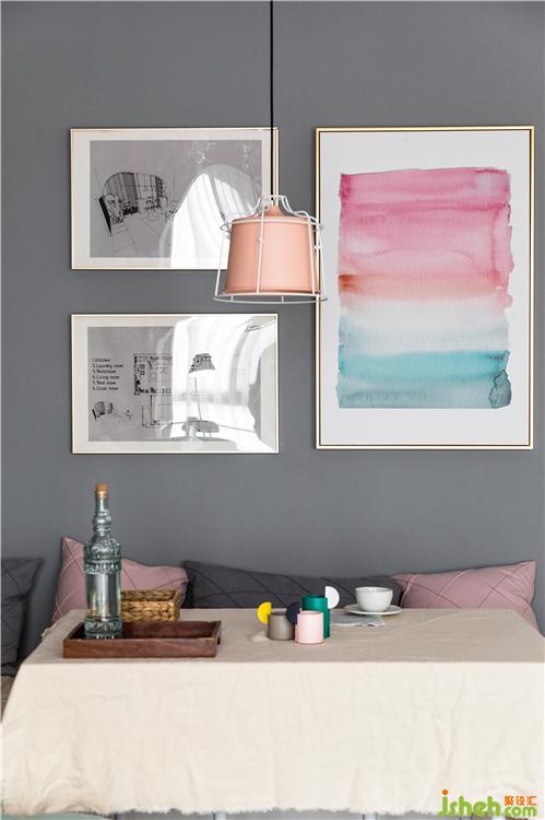 餐厅“L”型卡座,充分的将转角空间合理利用,墙面的装饰画其中一幅为本案的实际户型图。
