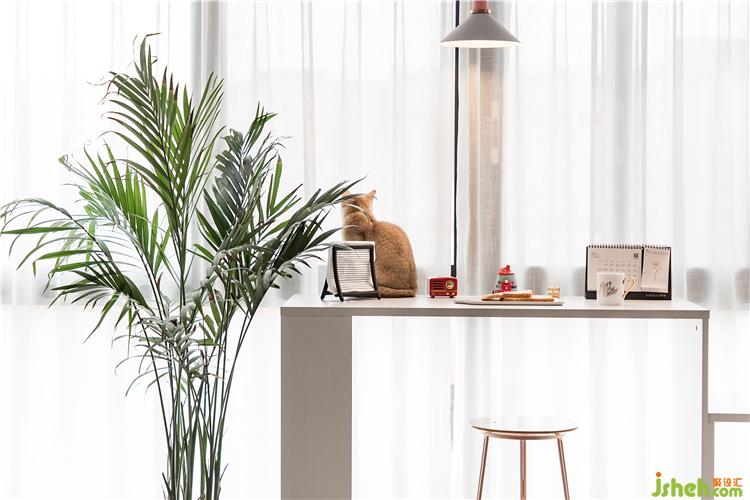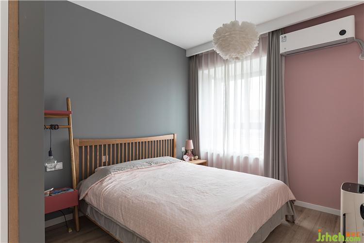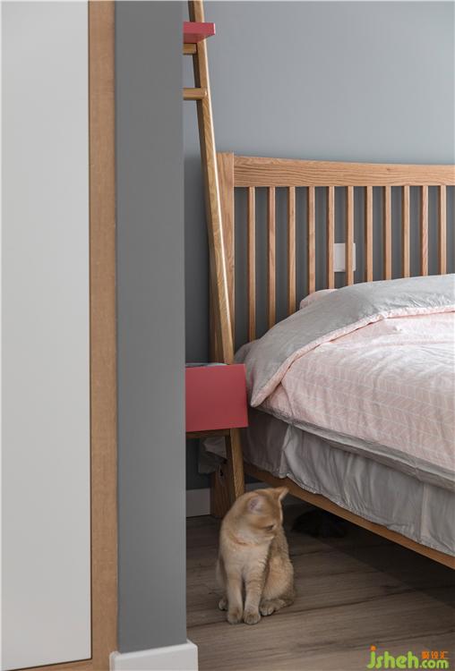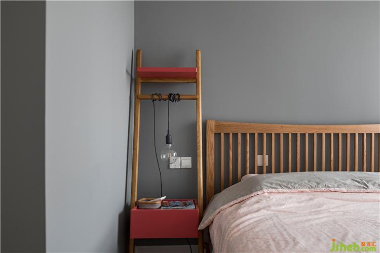 床头柜也选的比较简单,一边是云梯式床头柜,集合了床头柜、置物架以及衣架以种功能。家装设计