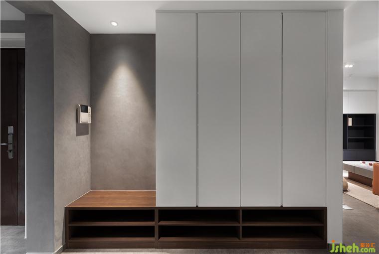 业主喜欢坐着换鞋,而且喜欢不用打开柜门就能拿到鞋。所以鞋柜下面的部分考虑镂空的形式,方便放当季的鞋子。柜子左边的换鞋区的位置考虑和鞋柜一体,增强整体性。
