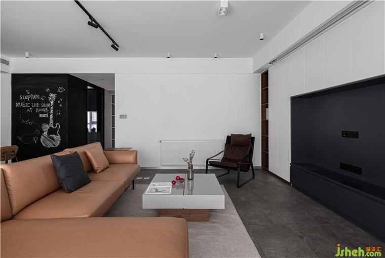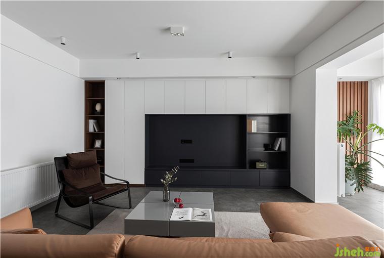 客厅因为有大量的书籍,零食,以及其他杂物的储物需求,所以客厅的整面墙考虑了储物柜的设计。