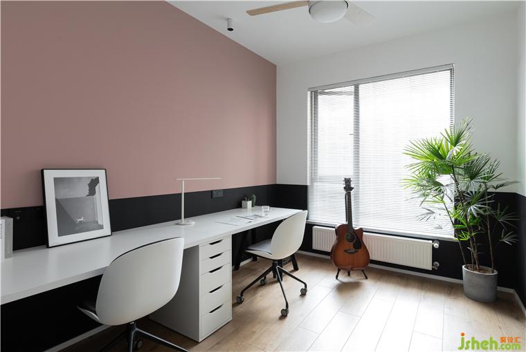 书房的乳胶漆颜色采用了黑色半墙,靠近书桌的那面墙运用了业主喜欢的脏粉色处理,增加了整个空间的层次感。