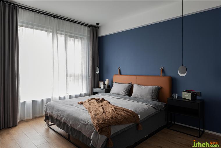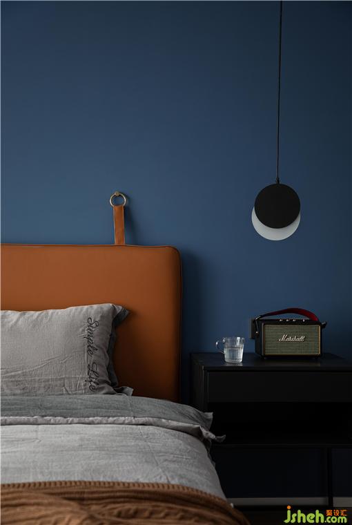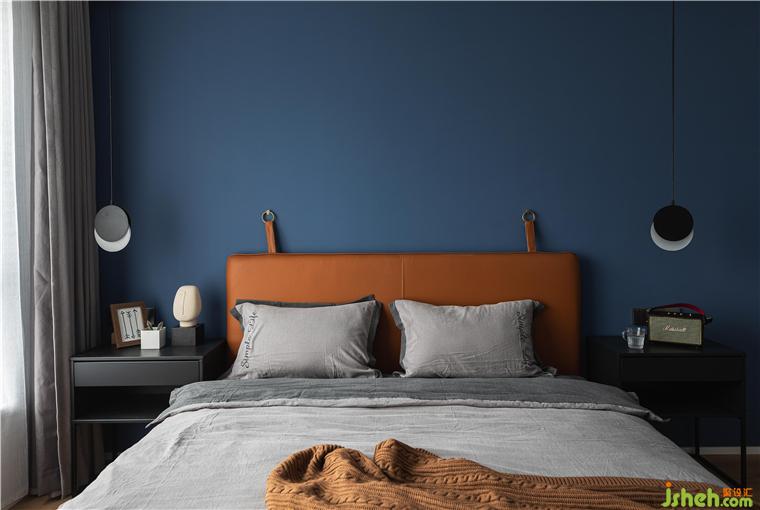 主卧的背景墙面刷了深蓝色乳胶漆,烘托整个空间宁静,深邃,让人完全可以放松下来。
