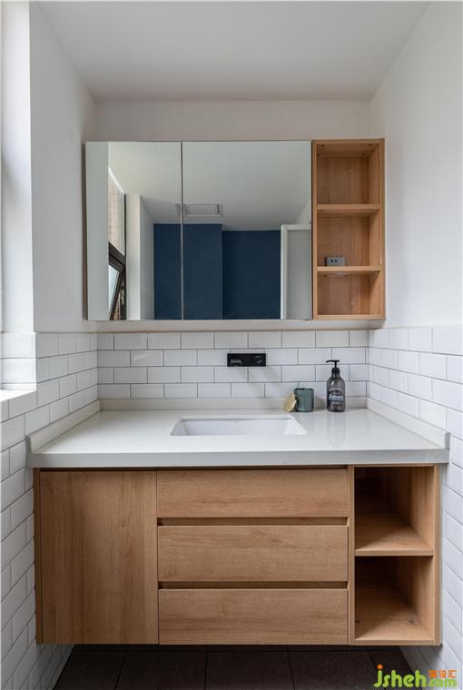 进入主卫的门考虑了日本的折叠,性价比颜值都很高,而且耐水耐用。因为不设置淋浴对防水的要求不高,所以主卫考虑了面包砖半墙的形式,空间显得更精致。