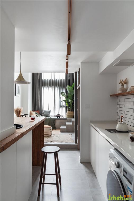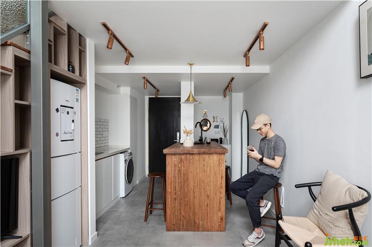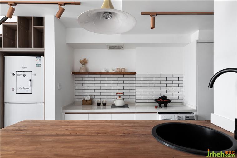 吧台与餐桌相互结合,小水槽就近设计在吧台上边缘,无论是吃一份简餐还是水果,有了它的存在就不用手忙脚乱的准备食材和清洗餐杯、水果了。吧台与对面橱柜一起组成开放式餐厨空间,满足使用者轻度餐饮,左边的冰箱门上,写着小两口对即将到来的客人的祝福与期待。