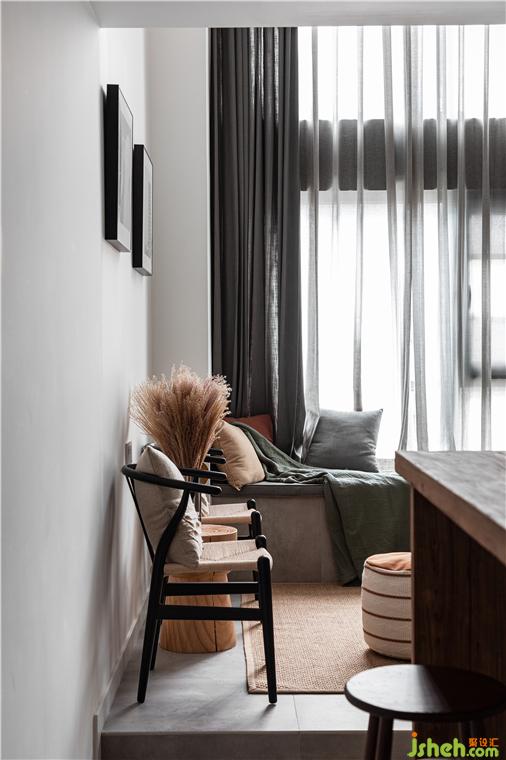 飘窗与沙发结合设计、联系上地台、带置物空间的楼梯的设计,界定出客厅的新范围,也减低了原本过高的飘窗的高度,让飘窗变成了舒适沙发。装修设计