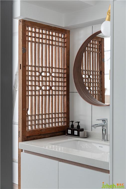 浴室柜旁的隔断是我们从二手市场淘回来的老门板,经过设计师“贾师傅”的一番巧手改造打磨成新的门板。从废物摇身一变成了有颜值有故事的女(装)同(饰)学(物),为空间增加一番独有的东方气质。淋浴间与睡眠区之间设计了一扇长条形采光窗,用锤纹玻璃阻隔视线,制造出犹抱琵琶半遮面的效果,让位于屋内的淋浴间也能有充足的自然采光,同时保证了使用者的隐私性。