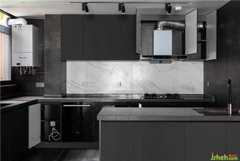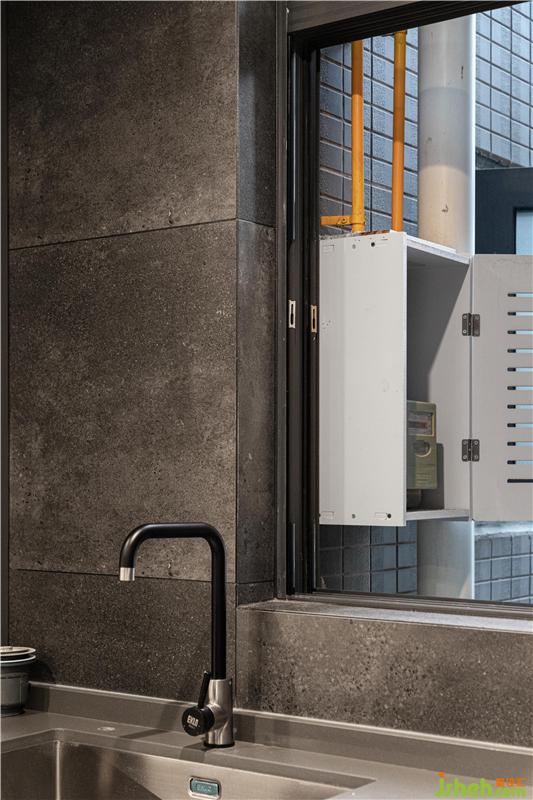 将冰箱内入,燃气表也移至了厨房的窗外,并用PVC保护盒进行保护,使整体看上去更简洁大方。还将整个厨房的所有管道都隐藏于橱柜内部,由于明黄的天燃气管在整个空间显得太过于突兀,于是我们选择给他点颜色瞧瞧 — 涂黑它。