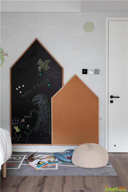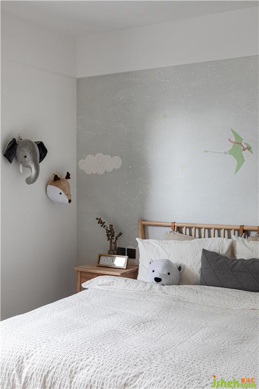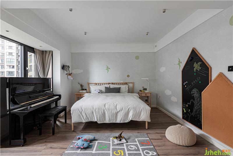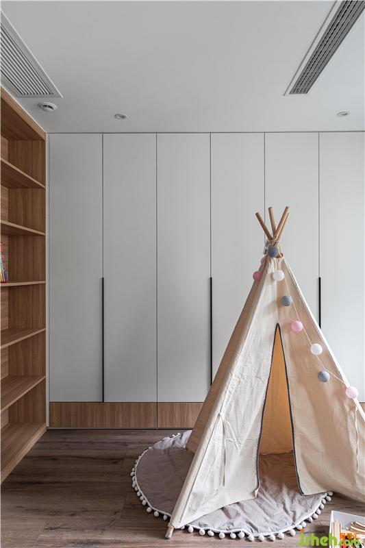 将两个次卧打通后变成了现在的儿童房,最大程度的提升空间舒适性。既是睡眠区,也是业主孩子布丁哥哥的游乐区及学习区,一个房间包含了多种可能。由于布丁哥哥还小,所以更多的是大面积空间留白,让孩子有足够宽敞的玩耍区。游乐区旁设计了整面墙的柜体,方便玩具的收纳。也没有忘记空间与儿童的成长关系,窗边也为长大后的他,预留了书桌与钢琴的摆放位置。