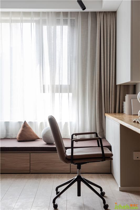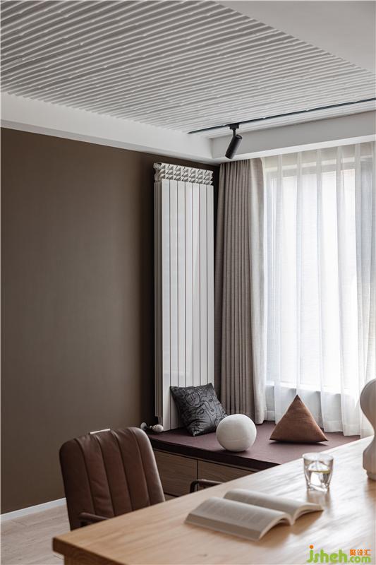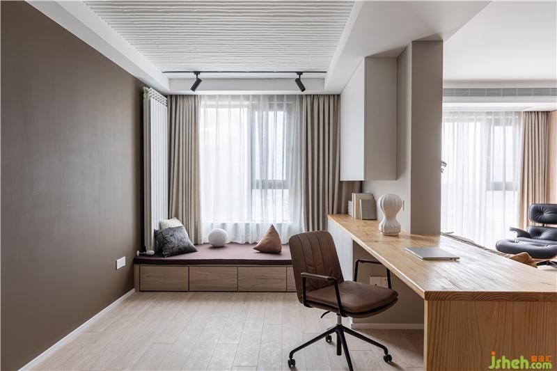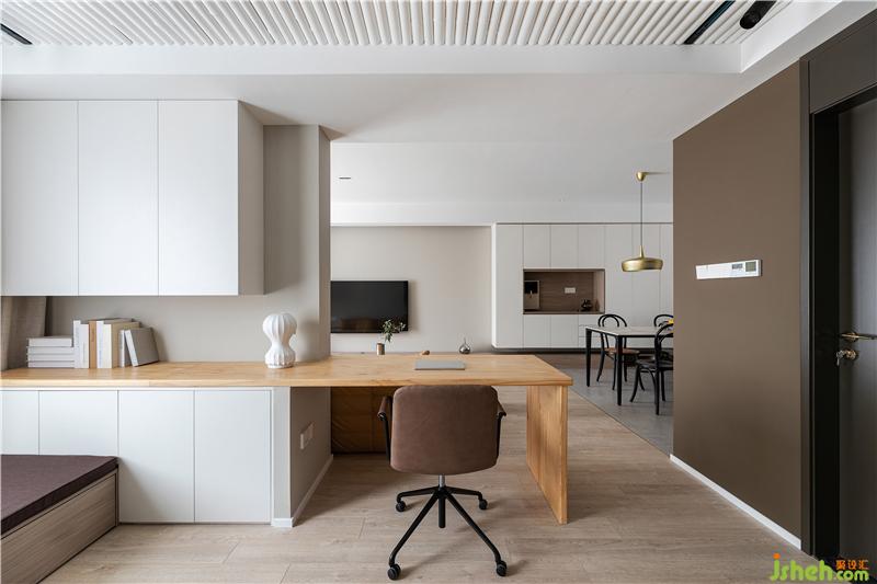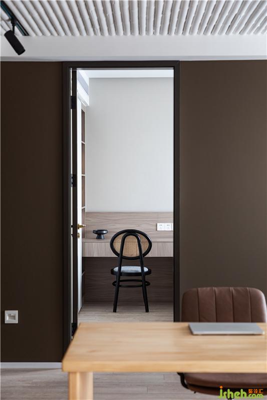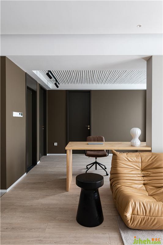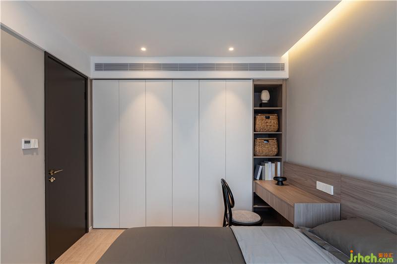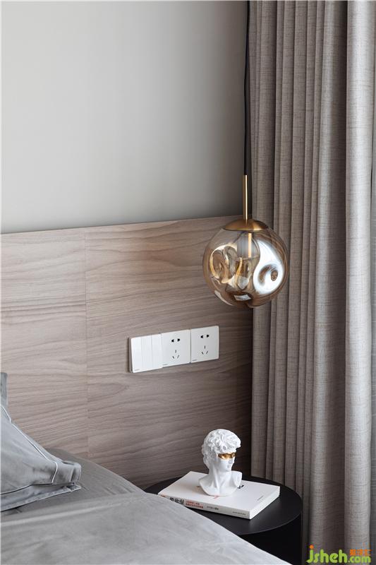 延续特调的浅咖至主卧,有趣的是,干净统一的底色恰巧与小区的外墙形成了默契。橡木的纹路肌理透露着大自然留下的痕迹,与墙面和茶玻床头氛围灯相互呼应,产生奇妙的美学反应。