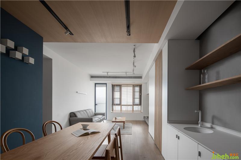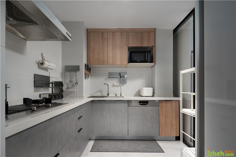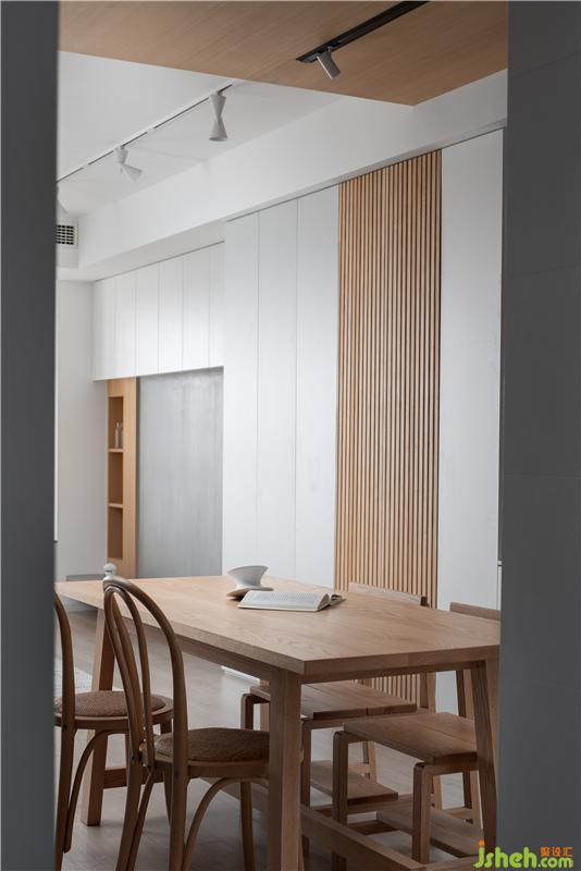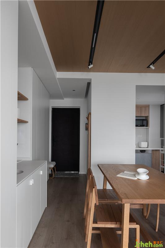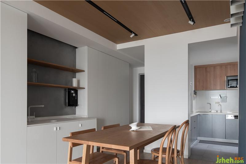 餐厅区增加西厨功能,屋主们比较喜欢吃零食,所以一组简约置物架就显得尤为重要,这个区域也补充厨房收纳空间的不足。