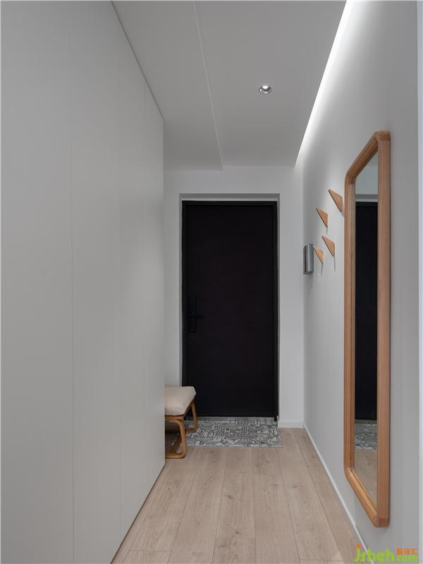 为了保证空间的干净,整个公共区域仅用入户延伸至飘窗台的墙面做了一组大小不一的收纳柜,保证收纳合理性。一组换鞋凳+穿衣镜的搭配,适当的点缀玄关,为家人的外出和归来做好最后一道准备。