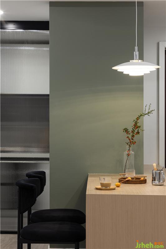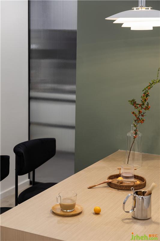 改造后的餐厅与厨房各自独立又相互依靠,豆绿与橡木,是夏天里的绿豆味雪糕,自然与清爽。定制餐桌延伸至入户口,方便屋主随手放置和携带日常所需小物件。