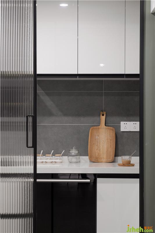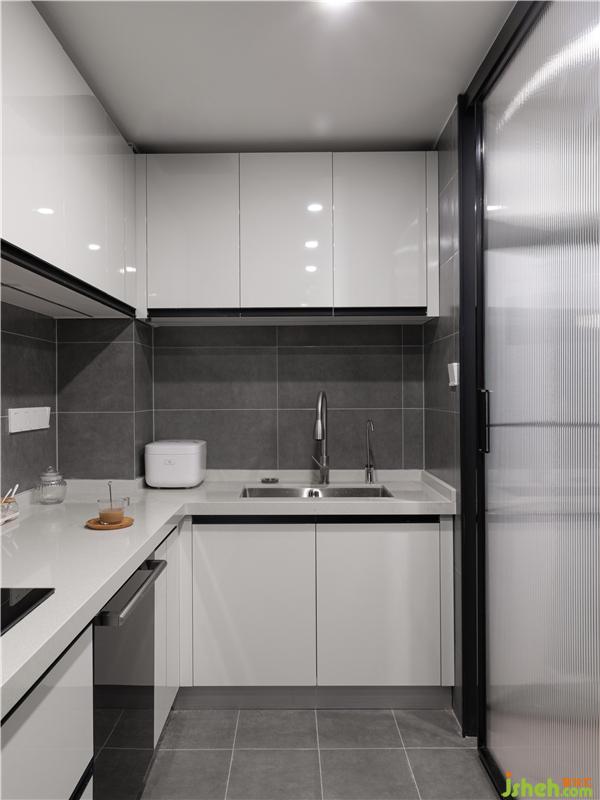 厨房纳入生活阳台以后,使用动线更加灵活便捷,黑白灰也让不大的厨房更加大气,整洁。