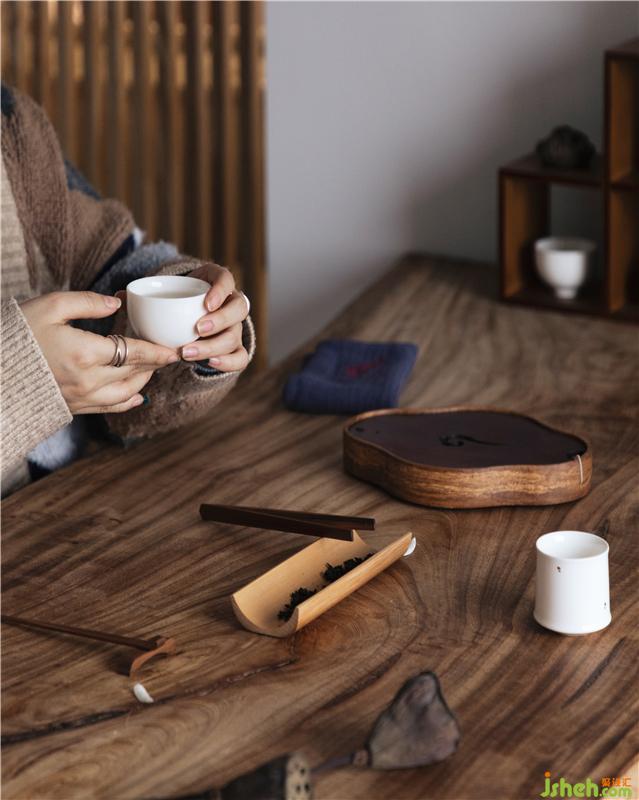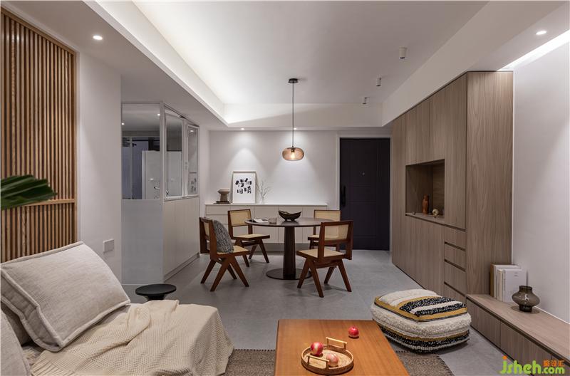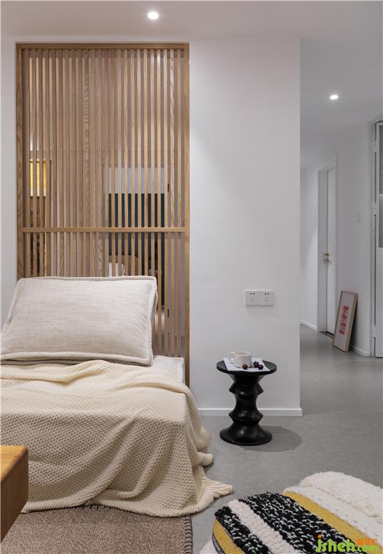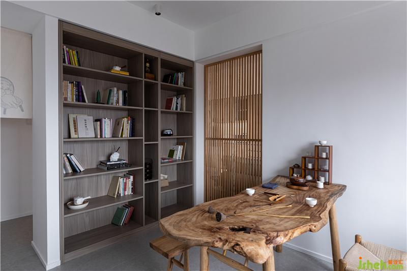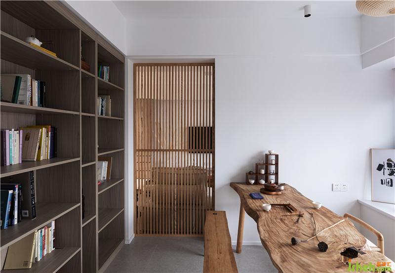连接客厅与茶室的隔断利用一扇木格栅,从而达到视觉上的空间延伸。正对窗户的墙面以置物架的形式作为全家福和100多本书籍以及茶室物品的“家”。