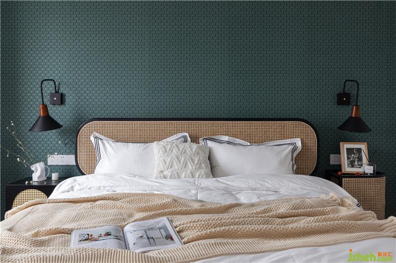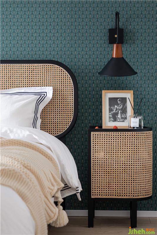 床头背景墙我们选择了奥丽芙的复古鎏金细节图案的艺术墙纸,也是整个主卧空间的点睛之笔。AB款的藤编床头柜相互照应且独立。