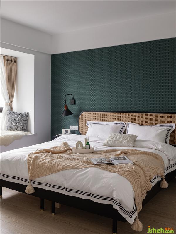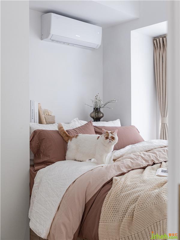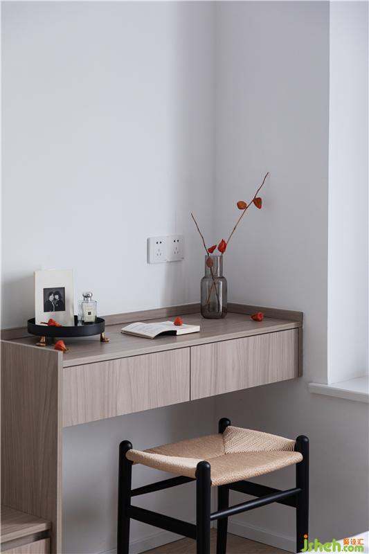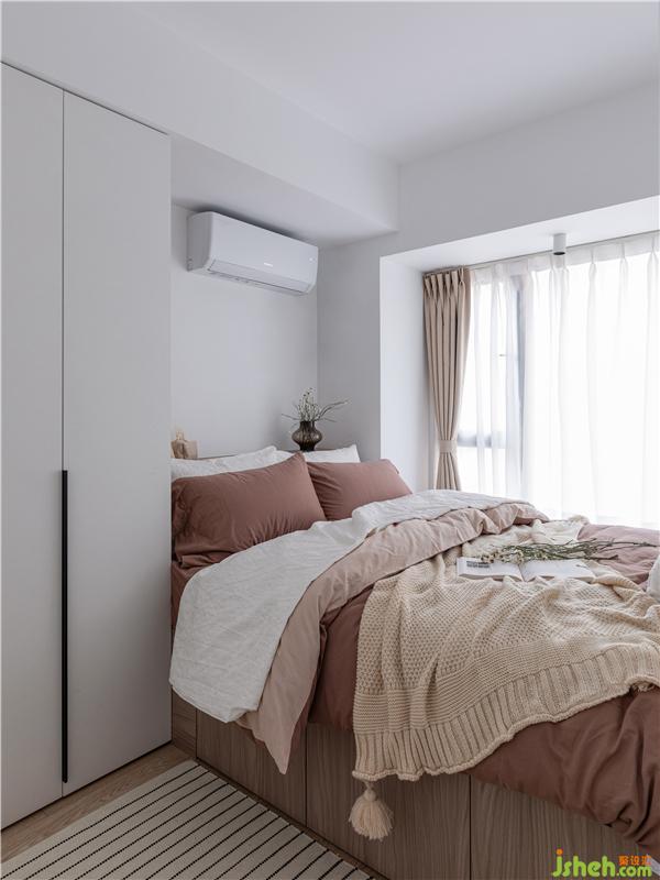 次卧是屋主小姐姐的房间,也是这个房型采光最不足的空间。在靠近飘窗台的位置以榻榻米+床头收纳柜的形式满足空间功能上的需求。