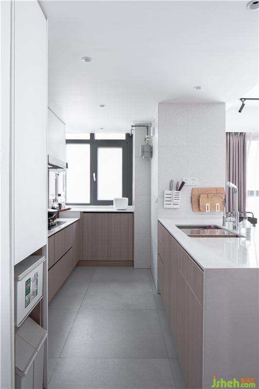 厨房是典型的非隐私封闭空间,开放式设计也为了让家人更好的交互。橱柜水盆柜为双面设计,背面的薄柜存放水杯、水瓶,使用时取出杯子,起身稍加冲洗,即可取用RO纯水。