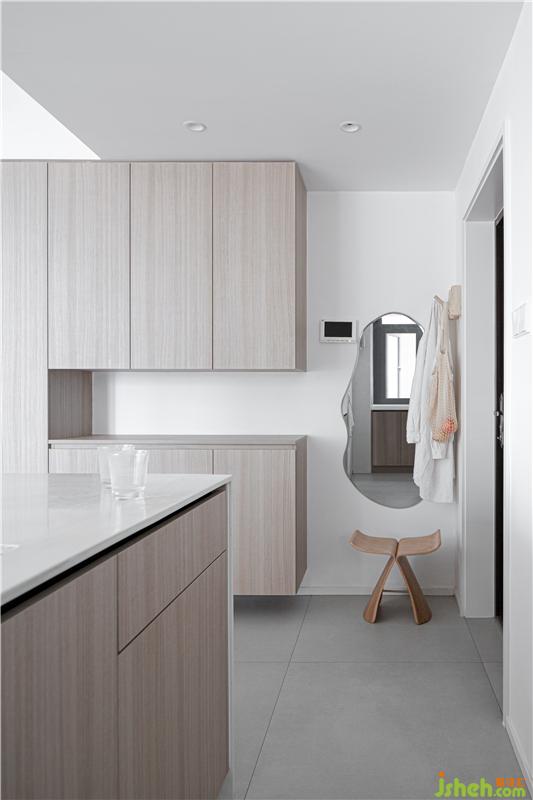 多功能集成柜与入户门之间留出的空间,安装了一鸣外婆心心念念的全身镜,柳宗理的蝴蝶凳作为换鞋凳,可以让年迈的老人很安心的坐着换鞋。