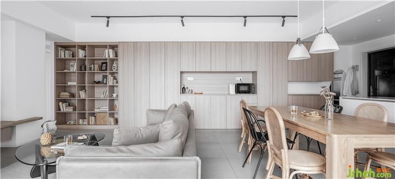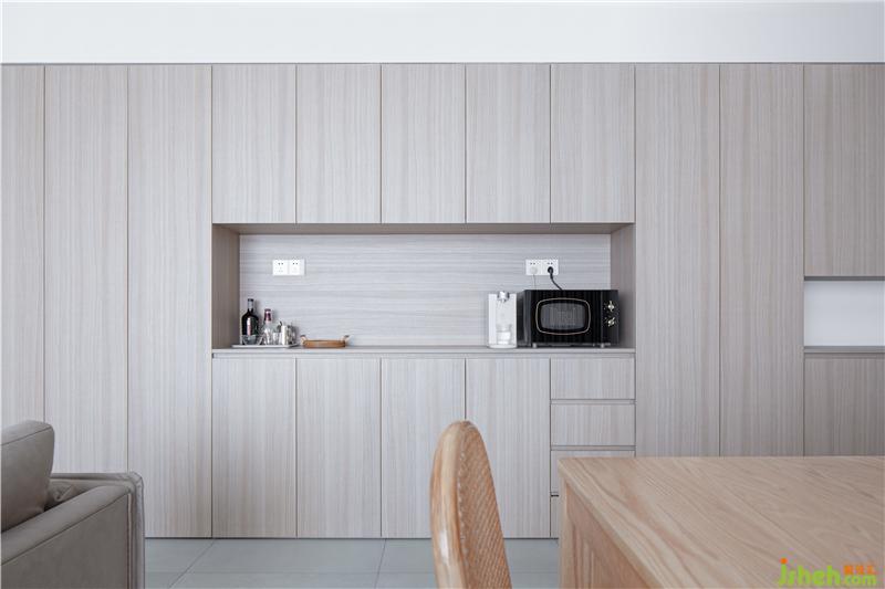 多功能集成柜,从左到右依次为书柜/展示区、中小杂物区、餐边柜区、鞋柜区。而餐边柜部分更是兼顾着起居和餐厨两个区域的高频使用。在柜体材质上选择了偏灰的直纹板材,造型简洁硬朗。