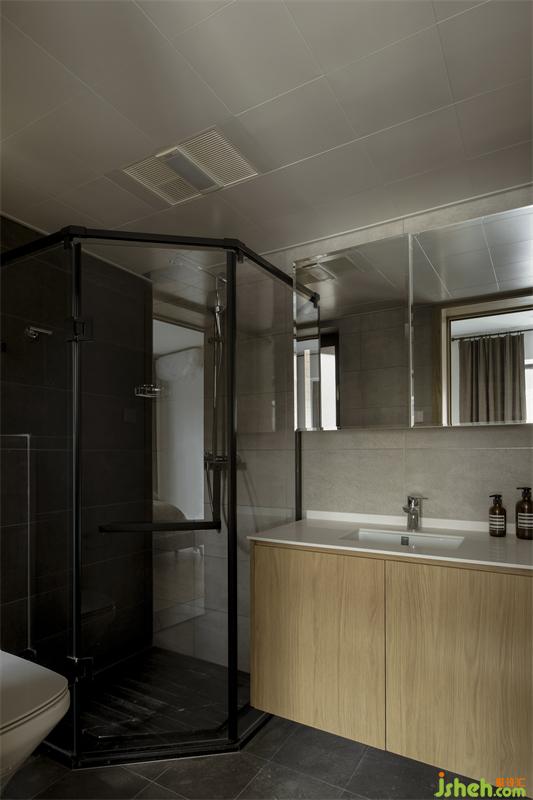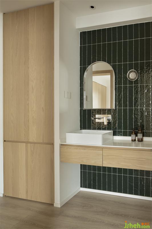移位的门洞巧妙地缓解了次卫的压力,将原次卫的所有功能剥离部分功能出来,仅保留淋浴和入厕功能,将洗漱功能放置在原主卧进门处,利用多出来的空间增加家政柜。