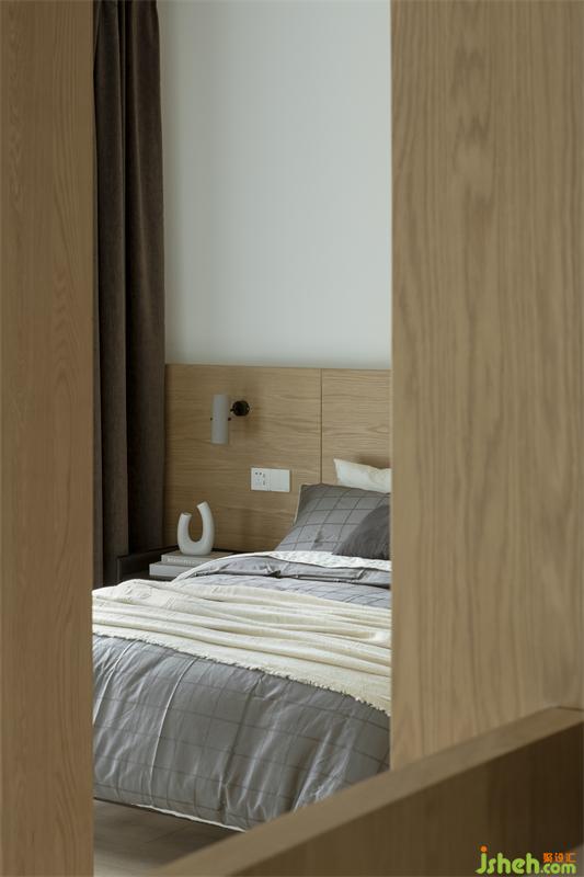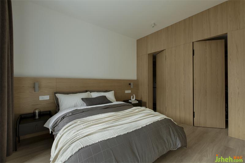主卧原本需要通过一条悠黑狭长通道进入,移门后,便省出了一间独立衣帽间。主卫生间和衣帽间的进门的墙体做了隐形门处理,避免主卫门对床的尴尬。