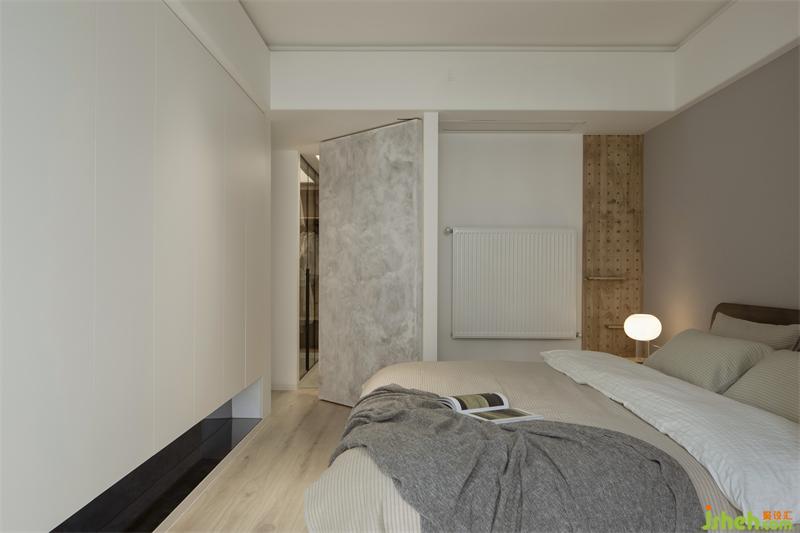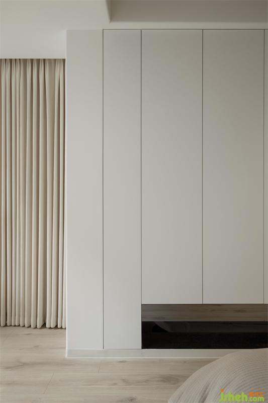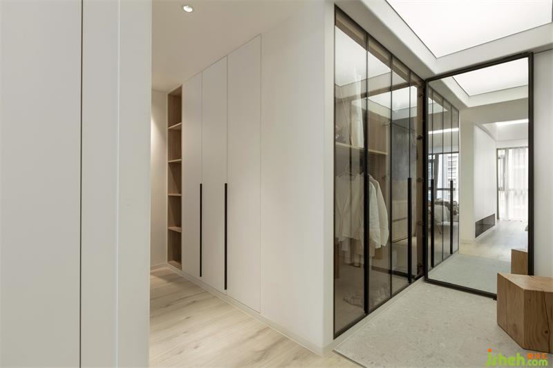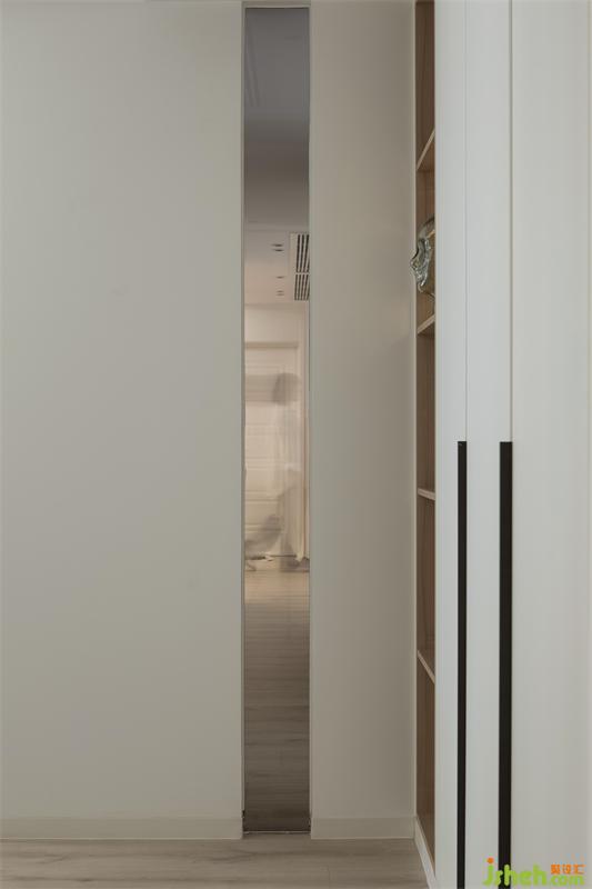 衣帽间与主卧室的连接同样采用地弹簧门的设计,定制木门表层处理则是设计师亲手完成的艺术漆面,门不止遮挡视线的作用,合理利用让它变成一幅与空间高度融合的画 。