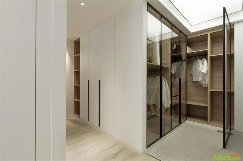 衣帽间采用了软膜天花的设计更好的模拟天光,同时加入地弹簧的旋转镜,从视觉上拓展空间的宽敞感也为屋主换衣时提供补光效果;