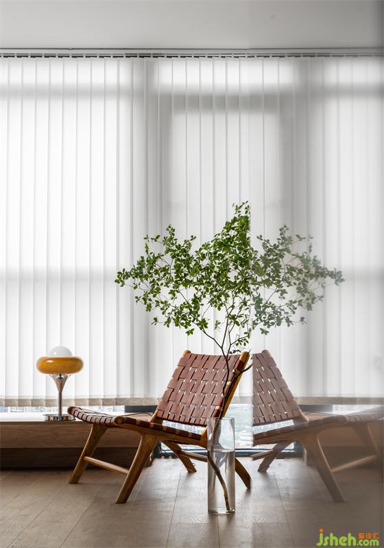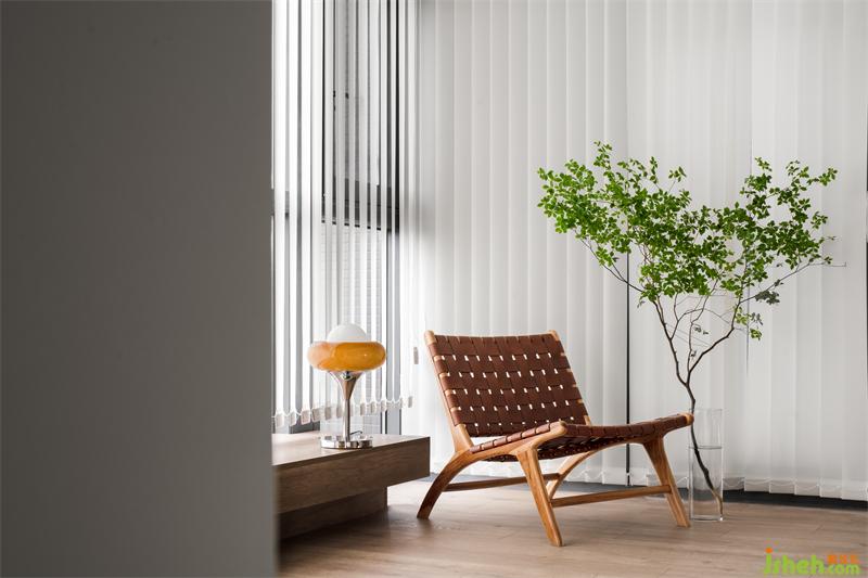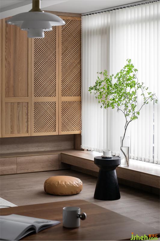 阳台装修设计了一组收纳柜体,补充了客厅区域储物空间。藤编的元素加入,让实木的柜门丢掉了沉闷。自然=舒适,鲜切吊钟赋予这个家更多的生命力。